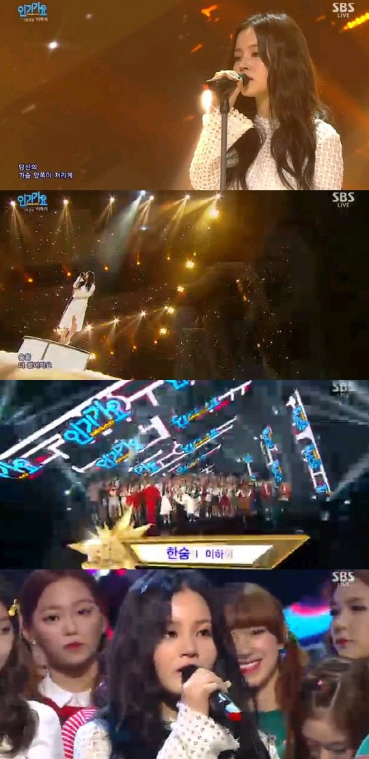 20일 방송된 SBS '인기가요'에서는 마마무, 이하이, 지민-시우민이 1위를 놓고 경합을 벌인 가운데, 이하이가 '한숨'으로 1위를 차지했다.
