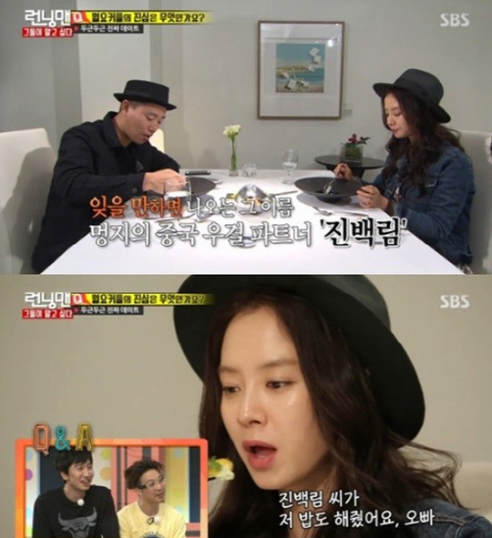 식사를 하던 중 개리는 송지효의 중국판 '우리 결혼했어요' 가상 남편 진백림을 언급했다.