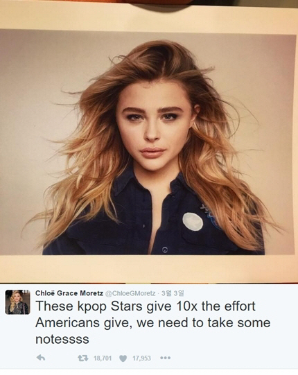 [스포츠조선닷컴 김영록 기자] 헐리우드 배우 클로이 모레츠가 '문제적 남자'에 출연한 가운데, K팝 팬인 그녀가 미국 가수들에게 날린 일침에도 관심이 쏠리고 있다.