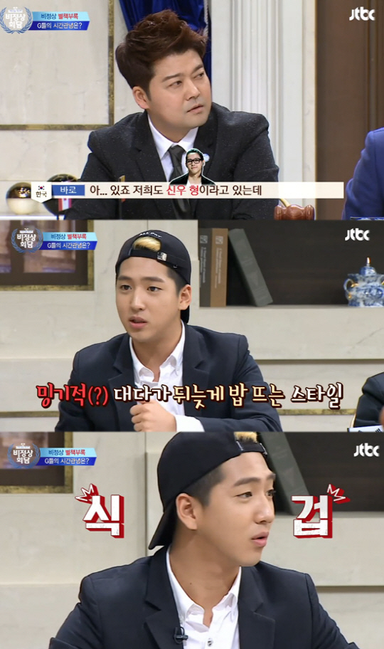 이어 그는 "항상 느긋하다. 우리가 밥 먹을 시간이 10분 밖에 없다고 하면, 밍기적 대다가 5분 남기면 우리는 다 먹었는데, 밥을 까는 스타일이다"고 설명했다.