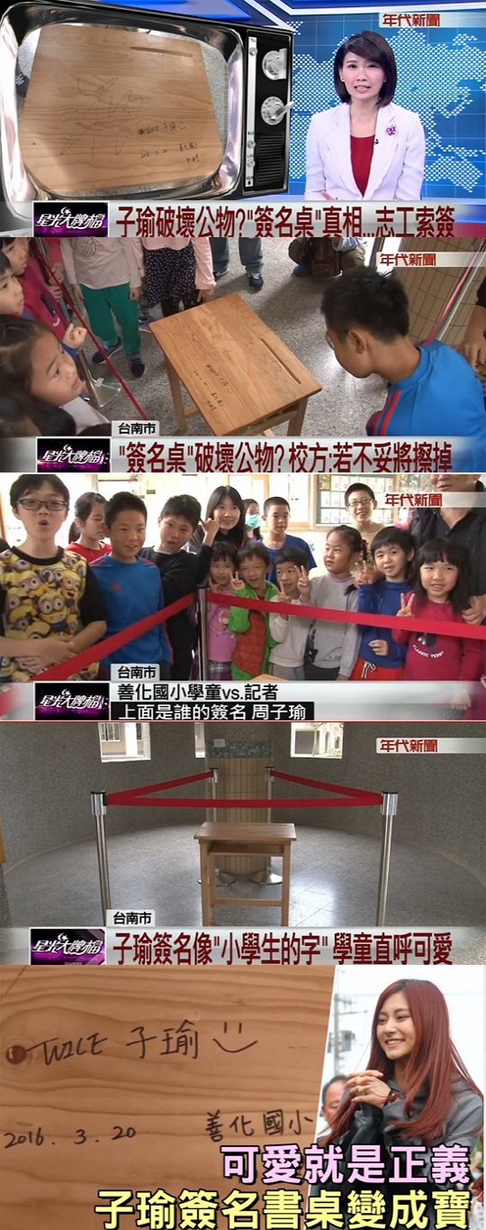 21일 대만 뉴스채널 낸다이는 "쯔위가 공공재산을 파괴? 싸인 책상 논란 진실공방" 등의 제목으로 쯔위가 시험 본 책상을 취재했다.