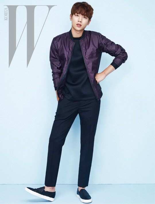 서강준은 화보에서 화이트 셔츠에 그레이 가디건을 매치해 단정한 룩을, 바이올렛 컬러의 보머 재킷 스타일링에서는 이너와 팬츠를 같은 계열로 매치해 완벽한 남친 룩을 선보이기도 했다.