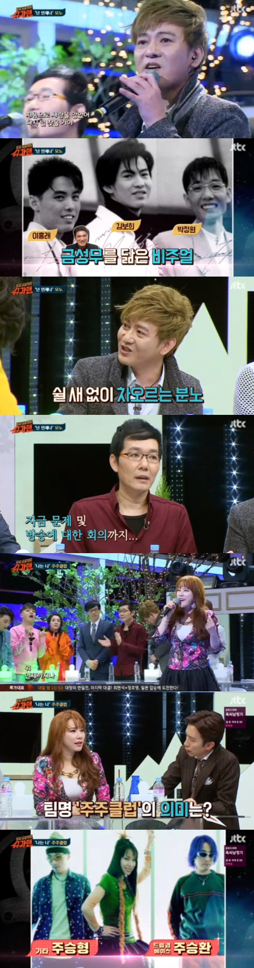 22일 오후 방송된 JTBC '투유 프로젝트 - 슈가맨'에는 쌈디&그레이와 장미여관이 쇼맨으로 출연해 역주행송 대결을 펼쳤다. 슈가맨으로는 원조 꽃미남 3인조 밴드 모노(보컬 김보희, 베이스 박정원, 키보드 이홍래)와 혼성밴드 주주클럽이 등장했다.