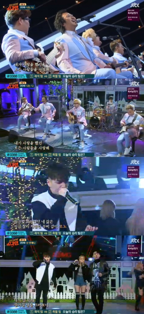 이어 등장한 유재석 팀의 쌈디&그레이는 '2016 NEW 넌 언제나' 무대를 공개했다. 경쾌한 분위기와 보컬의 미성이 인상적인 원곡을 마이너 코드를 사용한 힙합 R&B로 재해석했다. 여기에 여성 보컬 후디가 피처링으로 참여해 귀를 사로잡았다.