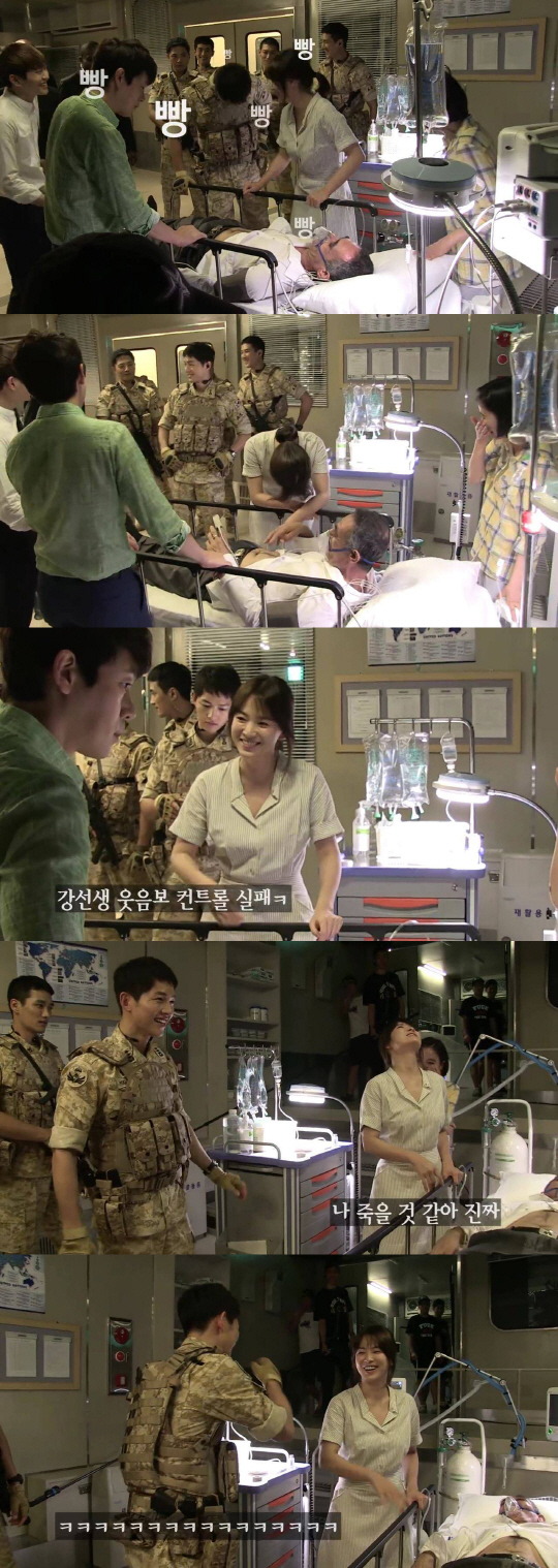 환자로 출연한 외국인의 장엄한 연기에도 불구하고, 송혜교가 순간 웃음을 터뜨렸다. 웃음이란 전염되기 마련, 유시진(송중기 분)을 비롯한 다른 출연진들도 저도 모르게 잇따라 웃음을 터뜨렸다.