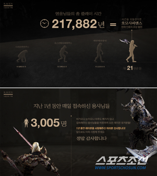 40일 만에 일일활동유저수(DAU) 100만 명 돌파, 78일 만에 누적 다운로드 500만 건을 넘어서면서 수많은 유저들의 힘으로 1년간 사랑을 받은 '레이븐'의 총 플레이 시간은 21만7천882년으로 조사됐다. 이는 현생 인류의 조상으로 알려져 있는 호모사피엔스가 출현한 20만 년 전이라는 기록과 같은 것이다.
