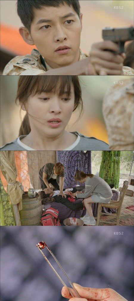 이에 유시진은 "살려요 당신은 의사로서 당신의 일을 해요, 죽여할 상황이 생기면 죽이는 건 내가 할테니까"라고 말했고, 강모연은 아구스에 몸에 박힌 총알을 빼며 의사로서의 모습을 보였다.