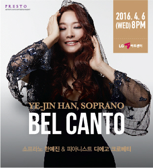 매력적인 고음, 풍부한 저음, 그리고 섬세한 감정 표현으로 '한국의 마리아 칼라스'로 불리는 소프라노 한예진 전 국립오페라단장이 'Bel Canto-아름다운 노래'라는 타이틀로 독창회를 연다. 오는 4월 6일 오후 8시 LG아트센터.