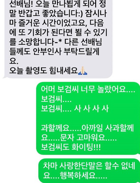 박보검은 먼저 홍진경에게 '선배님! 오늘 만나뵙게 되어 정말 반갑고 좋았습니다. 잠시나마 즐거운 시간이었고요, 다음에 또 기회가 된다면 뵐 수 있기를 소망합니다. 다른 선배님들꼐도 안부인사 부탁드릴게요. 오늘 촬영도 힘내세요'라며 예의 바른 문자를 남겼다.