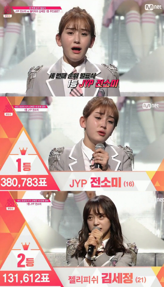 1위는 전소미였다. 전소미는 "마음 조리고 있었는데, 응원해주셔서 정말 감사하니다"며 눈물을 흘렸다. 이어 2위는 김세정이었다. 그는 "모두들 너무 감사하다"며 "꿈의 끝자리에서 마주하자"고 모두를 응원했다.