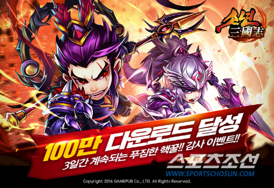 한편 게임펍은 '소년삼국지' 100만 다운로드 돌파를 기념해 29일부터 31일까지 3일간 게임 이용자들에게 10만 은화, 훈련단 등 게임 아이템을 지급하는 이벤트를 실시한다.