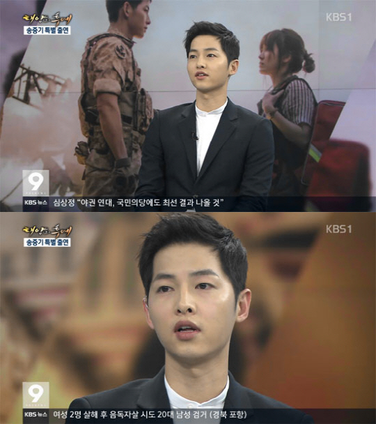 송중기는 극중 상대배우인 송혜교와의 열애설 등의 드라마 인기 실감에 대해 "드라마팀들과 회식도 자주한다. 안주거리로 웃으면서 이야기한다"면서, "드라마를 사랑해주셔서 감사할 뿐이다"라며 웃어보였다.