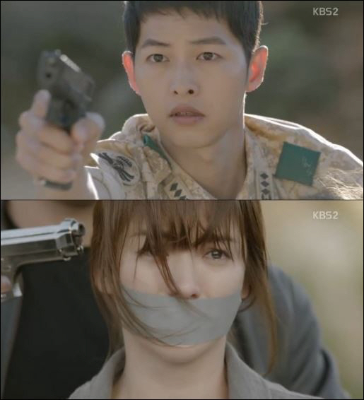 이어 수트를 벗고 군복을 다시 입고 등장한 '태양의 후예' 송중기는 11회에서 또 다시 위기에 휩싸였다. 유시진(송중기 분)의 옛 동료이자 갱단인 아구스가 강모연(송혜교 분)을 납치하면서 시진이 홀로 모연을 구해야 하는 절체절명의 위기에 놓여 시청자들의 눈길을 사로잡았다.