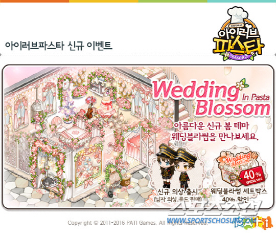 '아이러브파스타 for Kakao'에선 이번 업데이트를 기념해 각종 게임 내 아이템 할인 및 신규, 휴면 이용자 맞이 적응 이벤트 등 여러 이벤트를 진행하고, 봄을 맞이해 새로운 테마 '웨딩블라썸'을 출시했다.