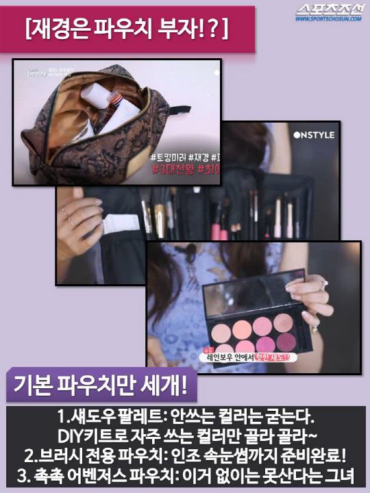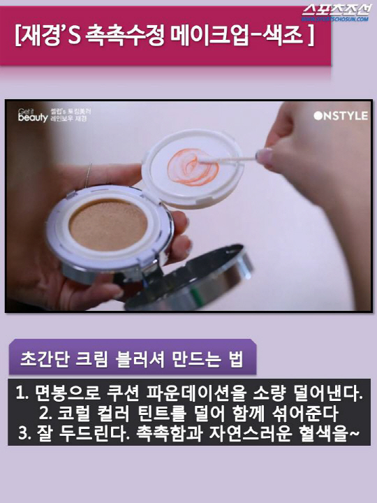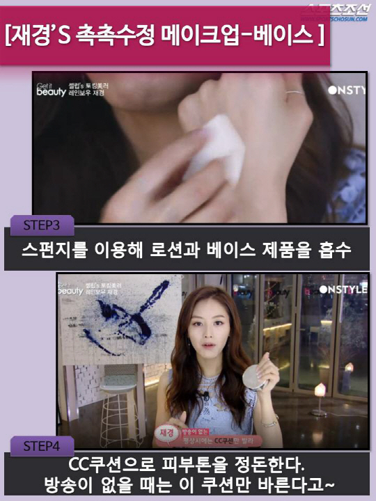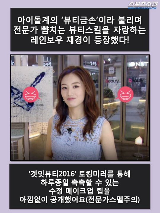 30일 방송된 온스타일 뷰티프로그램 '겟잇뷰티2016' 토킹미러 코너에서는 평소 전문가에 버금가는 메이크업 실력을 자랑하며 '뷰티돌'이라 불리는 레인보우 재경이 등장, 뷰티스킬을 아낌없이 공개했다. 특히 하루종일 촉촉하게 화장을 유지할 수 있는 수정 메이크업 팁과 아끼는 뷰티 제품들을 공개하며 그 이름을 실감케 했다.