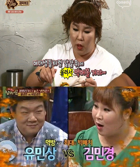 '먹요정'하면 김민경을 빼 놓을 수가 없다. 차원이 다른 '먹방'으로 매회 화제를 모으고 있는 코미디TV '맛있는 녀석들'에 출연 중인 김민경은 유민상, 김준현, 김민경, 문세윤 세 남자 사이에서도 절대 뒤지지 않는 먹방 실력으로 인기를 끌고 있다. 김민경은 어떠한 음식도 복스럽고 맛있게 먹는 건강한 매력으로 시청자들을 유혹하고 있다.
