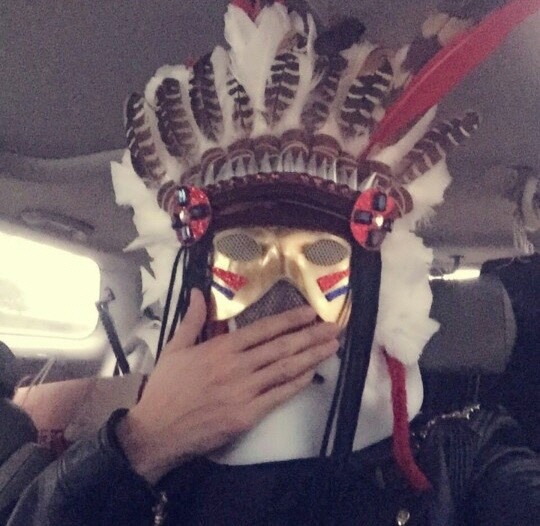 이와 함께 이동 중인 차 안에서 인디언 보이 가면을 쓰고 있는 인증샷을 게재했다.