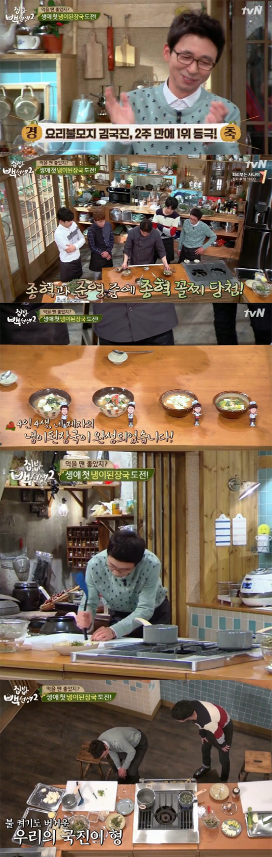 [스포츠조선 이유나 기자] '집밥 백선생'의 요리 불모지 김국진이 요리 2주만에 꼴찌 타이틀에서 탈출, 1위로 올라서는 기적(?)을 보여줬다.