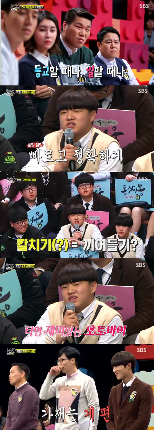 서장훈은 "기왕 배달을 할거라면 치킨보다는 피자 배달을 해봐라. 그러면 좀더 안전하게 탈 것"이라고 조언했다. 하지만 이 학생과 윤지현 군은 "원래 배달 갈 때는 그렇게 안 탄다. 배달하고 돌아오는 길에 그렇게 타는 것"이라고 답해 서장훈의 입을 막았다.