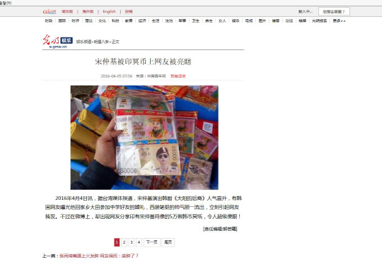4일 중국 포털 메인 화면에는 '송중기 사진, 성묘 지폐에 올라…'라는 제목의 기사가 게재됐다. 중국은 청명절 성묘 시기를 기준으로 각종 종이를 태우면 조상들이 저승에서 태운 종이를 쓸 수 있다고 믿는 풍속이 있다. 그래서 주로 돈을 많이 태우는데, 한국 5만원 권 지폐를 복사해 송중기의 얼굴 사진을 합성한 지폐가 등장해 논란이 되고 있는 것. 아무리 KBS2 수목극 '태양의 후예'의 인기로 송중기에 대한 관심이 뜨겁다고는 하지만 살아있는 사람의 얼굴을 청명절 지폐에 올리는 것은 너무했다는 의견이다.