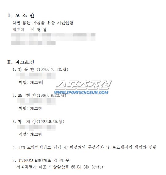 [스포츠조선 이유나 기자] 한부모가정 아동을 비하하는 개그로 논란에 오른 개그맨 장동민(37) 황제성(34), 조현민(36) 등 3명의 개그맨 뿐 아니라 해당 제작진 및 tvN 대표가 함께 피소됐다.