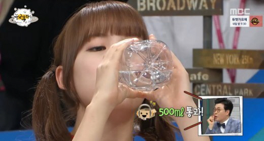 두 사람은 물통을 한 번도 떼지 않고 마셨고, 호기로웠던 데프콘은 500ml를 먹고 바로 포기했다. 그러나 예린은 흐트러짐없는 자세로 1L를 순식간에 마셔 놀라움을 자아냈다.