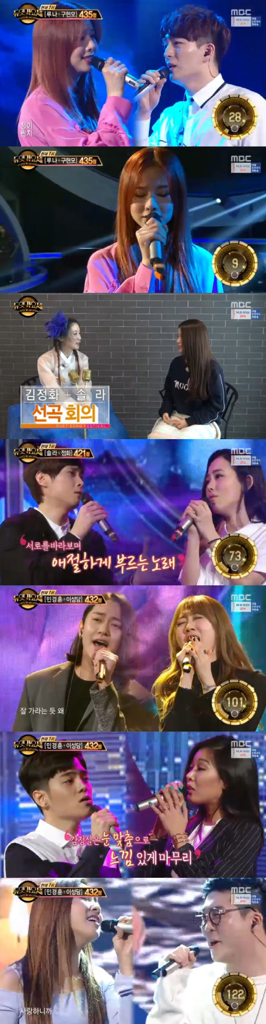 이어 루나는 노래하는 요리사 구현모와 임재범의 '너를 위해'를 불렀다. 루나의 아름다운 음색과 가수 못지 않은 가창력을 뽐낸 구현모는 진한 여운이 무대를 선보이며 435점을 획득해 민경훈 팀을 제치고 1위 자리에 올랐다.