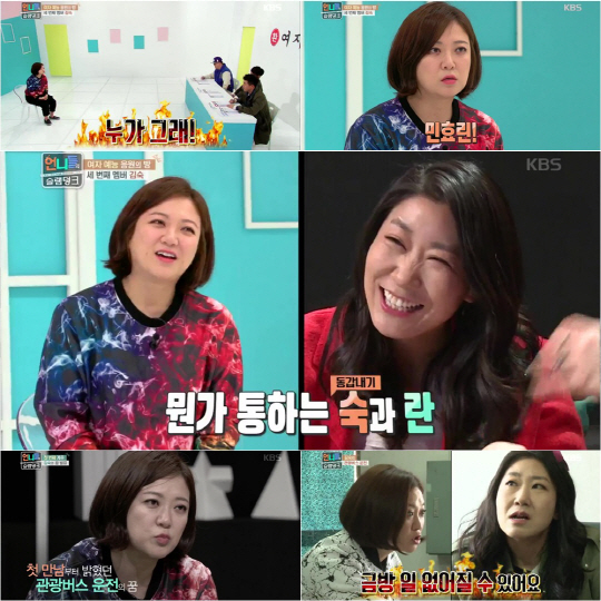 KBS2 '언니들의 슬램덩크' 김숙과 라미란이 찰떡 케미를 뽐냈다. 8일 첫 방송된 '언니들의 슬램덩크'에서는 김숙 라미란 홍진경 민효린 제시 티파니(소녀시대)의 첫 만남이 그려졌다. 멤버들 모두 솔직담백한 입담으로 시청자의 호응을 얻는데 성공했지만, 압권은 김숙과 라미란이었다. 동갑내기인 두 사람은 의외로 공통점이 많았다. 이들은 민효린과 친해지고 싶은 이유로 비슷한 외모를 꼽는 등 카리스마 예능으로 관심을 끈 것. 이에 시청자들은 '라숙콤보'라는 애칭을 붙여주기도 했다.