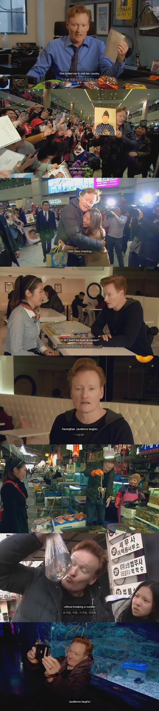 먼저 코난 오브라이언은 "한국 팬 써니 리로부터 한국을 방문해달라는 편지를 받았다"며 써니 리의 편지를 소개했다. 2014년도 대학수학능력시험 6월 모의평가 답안지에 편지를 쓴 써니 리에 감동한 코난 오브라이언은 "감사를 표하러 써니 리를 만나러 가겠다. 한국에서는 '코난쇼'가 방송되지 않지만 인터넷 덕분에 팬이 많다고 한다"며 인천국제공항을 통해 입국한 자신의 모습을 공개했다. 많은 팬의 환대를 받으며 한국땅을 밟은 코난 오브라이언은 "안녕하세요" "한국을 사랑해요"라며 외치며 특유의 재치를 발휘했다. 특히 자신을 초대해준 써니 리를 만난 그는 따뜻한 포옹과 함께 "초대해줘서 고맙다"고 인사를 건넸다.