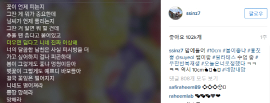 지난 2일 박신혜는 자신의 인스타그램에 "맘에 들어. 10cm 봄이 좋냐. 흥칫뿡. 필라테스 수업 중 무한반복 재생. 오늘은 너로 정했다. 역시 10cm. 네맘 내맘"이라고 썼다. 레인보우 지숙도 "어머 웬열 사이다. 제목부터 봄이 좋냐임. 웃다가 어느새 무한반복 중"이라는 글로 무한지지를 표한 바 있다.