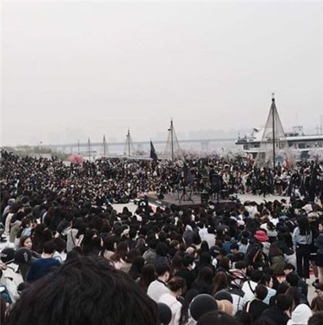 십센치가 벚꽃이 만개한 여의도에서 만원관중속에 버스킹 공연을 하고 있는 모습이다. 드레스코드 '블랙'에 따라 검은 의상을 입은 관중들이 여의도에 운집했다.