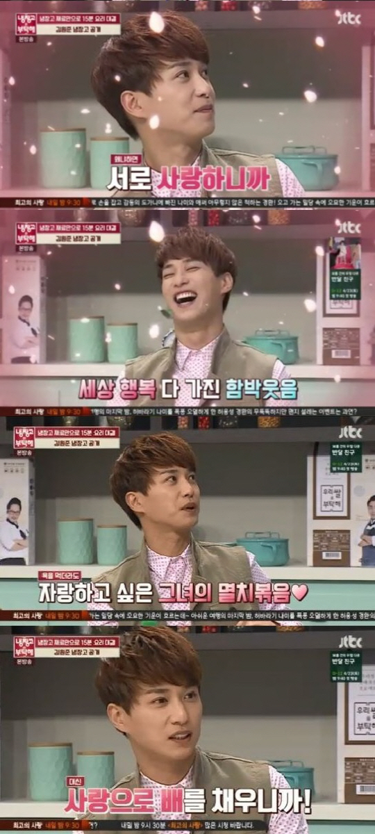 또 김성주가 냉장고 속에서 김원준의 어머니와 예비 신부의 어머니가 만들어 준 멸치반찬을 보고 "어머니가 만들어 준게 맛있냐, 장모님이 만들어 준게 맛있냐"고 짓궂게 묻자 "예비 신부가 만들어 준 게 가장 맛있다"며 센스있게 대답했고, 빈약한 냉장고 속 재료에 "대체 뭘 먹고 사냐"고 묻자 "사랑을 먹고 산다"고 답해 좌중을 폭소케 했다.
