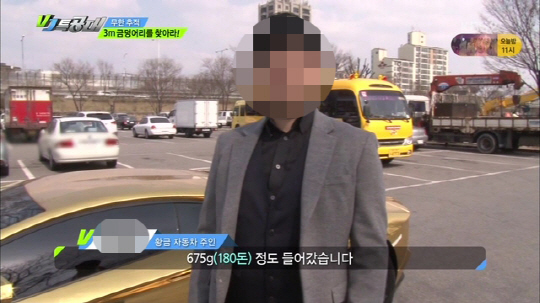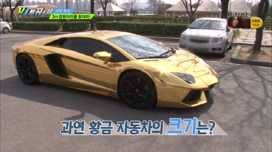 앞서 지난 8일 방송한 'VJ특공대-금덩어리를 찾아라' 편에서는 160kg에 육박하는 상상초월 금 공예품부터 황금 케이크, 황금 신발, 황금 욕조 등 금으로 만든 다양한 작품들을 소개하다, 달리는 3m 금덩어리인 황금색 람보르기니를 소개했다.