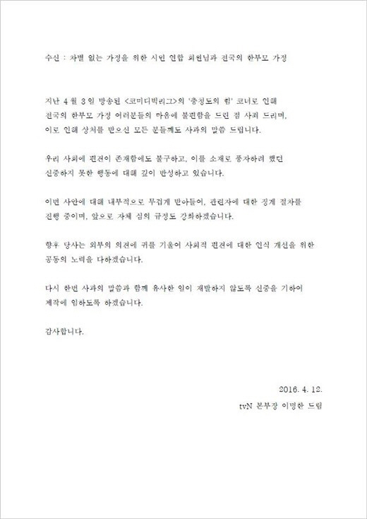 '차가연' 이병철 대표는 12일 스포츠조선과의 통화에서 "일단 tvN 측의 지속적인 노력과 사과가 회원들에게 진정성 있게 받아들여졌다"며 "고소장 제출 이후 tvN 관계자들이 지속적으로 방문해 직접 사과해왔고, 이명한 본부장도 공식 사과문을 들고 단체를 방문했다"고 밝혔다.