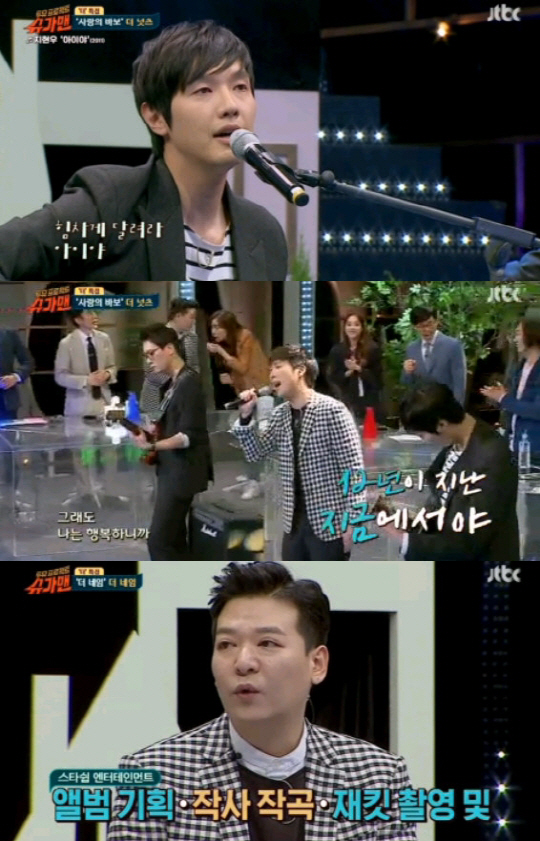 이어 두번째 슈가맨으로 '사랑의 바보'를 부른 '더 넛츠'가 등장해 눈길을 끌었다. 노래를 부른 후 더 넛츠 멤버 김현중, 박준식, 김우경, 지현우는 "많이 기억해 주셔서 감사하다"고 말한 뒤 "많은 분들이 지현우씨를 응원해주셔서 감사하다"고 전해 웃음을 자아냈다.