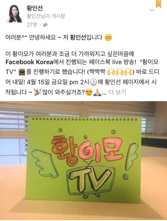 14일 황인선은 자신의 페이스북에 "여러분^^ 안녕하세요~ 저 황인선입니다"라는 인사를 시작으로 "황이모가 여러분과 조금 더 가까워지고 싶은 마음에 페이스북 코리아에서 진행되는 페이브스북 LIVE 방송! '황이모TV'를 진행하기로 했습니다 바로 드디어 내일! 4월15일 금요일 pm2시에 황인선 페이지에서 시작됩니다. 많이 와주실거죠?"라는 소식과 함께 스케치북에 '황이모TV'라고 직접 그린 그림을 게재했다.