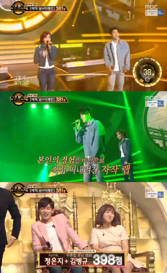 정은지의 감미로운 보컬과 강렬한 랩핑이 어우러져 청중평가단의 마음을 움직였다. 특히 본인의 경험을 담은 자작랩을 선보여 뭉클함을 자아냈다. 398점을 획득한 두 사람은 에릭남과 이예빈을 꺾고 1위에 올랐다.