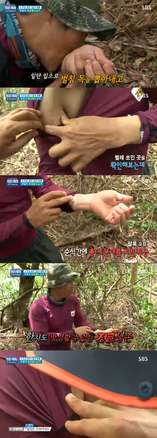 김병만은 기계체조 선수 출신의 운동능력을 가진데다, '정글의법칙'에 오랫동안 출연하며 일행 중에서는 '정글 전문가'인 출연자다. 그런 김병만조차 갑작스레 나타난 벌에게는 속수무책이었다. 김병만은 과거 대형 개미에 물려 온몸이 부어오르는 등 고통을 겪은 적도 있다.