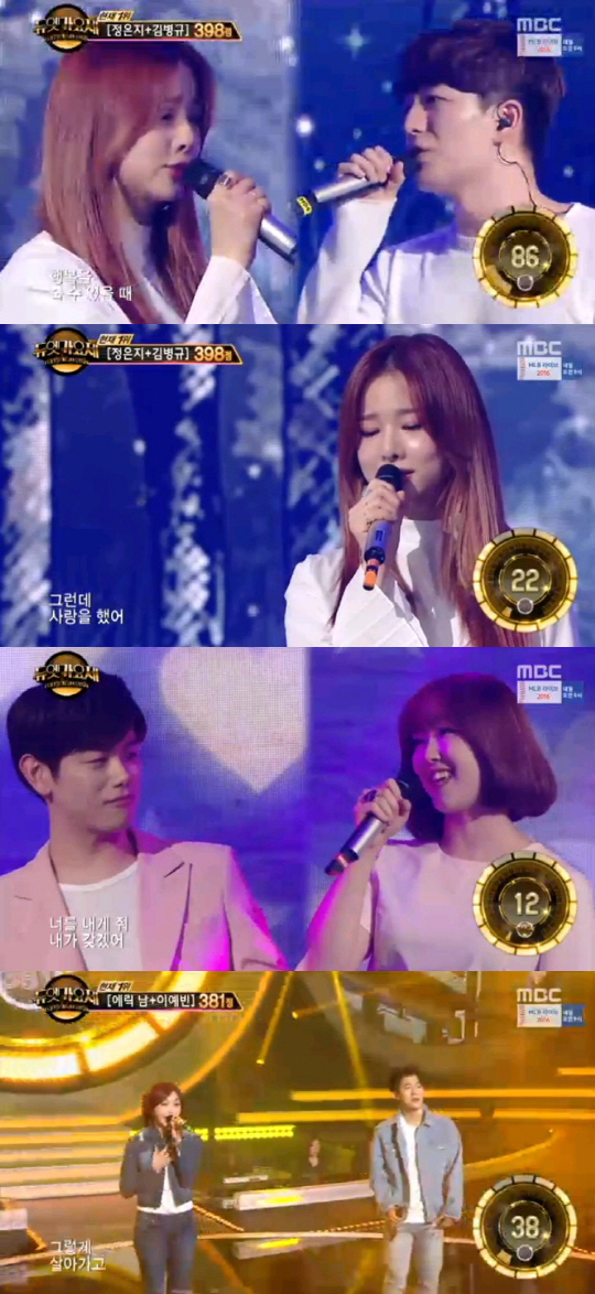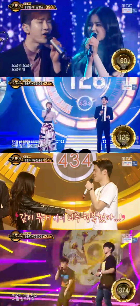네번째 무대는 솔지와 두진수 팀이 꾸몄다. MC더맥스의 '잠시만 안녕'을 선곡한 두 사람은 폭발적인 가창력과 애절한 하모니로 소름을 안겼다. 이들의 무대에 기립박수가 쏟아졌고 결국 총점 434점을 획득, 정은지와 김병규를 제치고 1위에 등극했다.