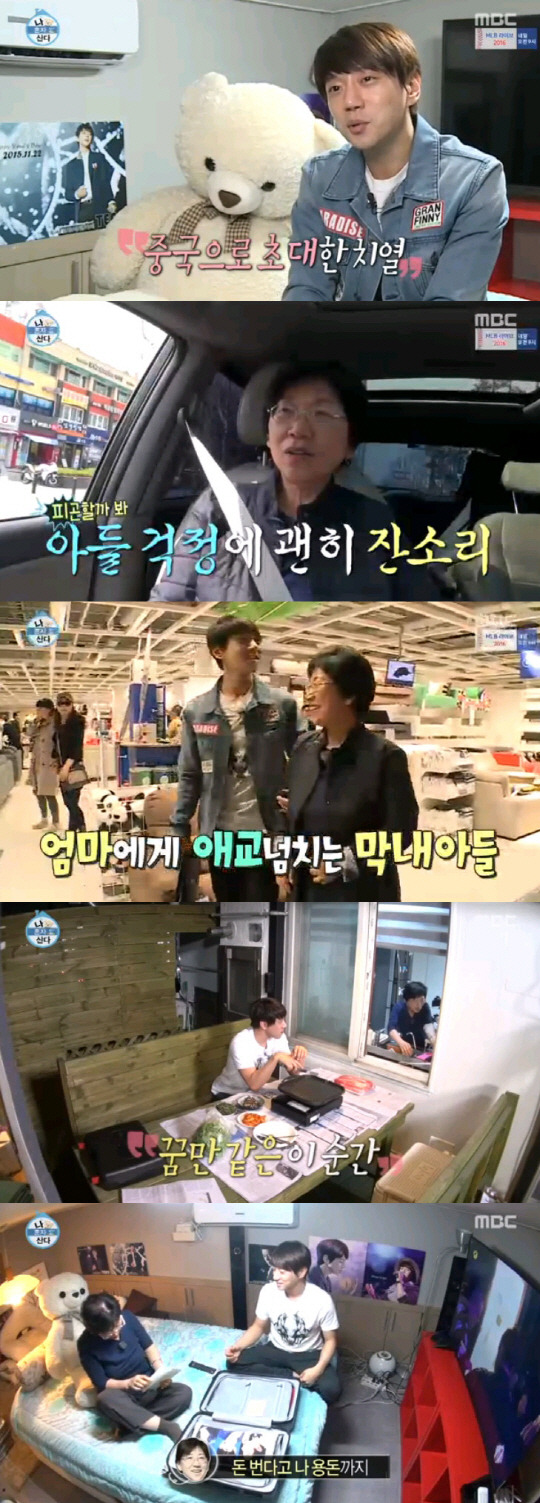 이어 집에 도착한 어머니는 아들의 지저분한 보금자리를 보고 "노숙자 집도 아니고 이게 뭐고"라며 잔소리를 쏟아내 웃음을 자아냈다. 그러나 황치열은 그런 어머니에게 애교 섞인 목소리로 변명하는가 하면, 어머니의 무릎에 머리를 대고 눕는 등 '신한류스타'가 아닌 애교쟁이 막내아들로 변신해 눈길을 끌었다.