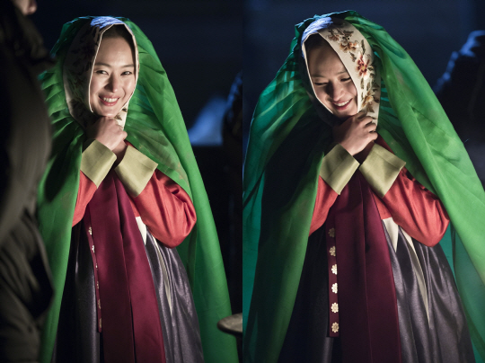공개된 사진 속 윤진서는 은은한 색상의 한복 차림이다. 그 위에 고혹적인 꽃무늬가 수놓아진 초록색 쓰개치마를 뒤집어 쓰고 있다. 두 손으로 쓰개치마를 콕 붙잡으며 얼굴만 쏙 내놓고 있는 윤진서의 모습이 시선을 사로잡는다.