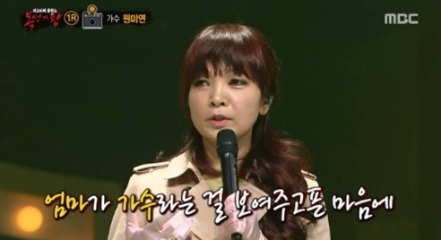 이후 원미연은 '복면가왕'에 출연하게 된 이유에 대해 "딸이 5학년인데 딸의 친구들이 너희 엄마는 '히트곡이 뭐냐'고 물어본다더라. 엄마가 가수라는 걸 보여주고 싶었고 모두가 공감할 수 있는 무대를 꾸미고 싶었다"고 밝혀 판정단들과 시청자들을 뭉클하게 했다. narusi@sportschosun.com