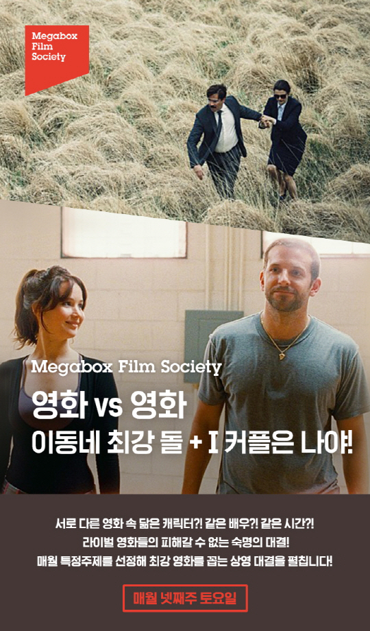 4월의 '영화 대 영화'는 '이 동네 최강 돌+I 커플은 나야'란 테마다. 23일 메가박스 코엑스 점에서 괴짜 커플의 좌충우돌 로맨스를 다룬 영화 '실버라이닝 플레이북'과 기묘한 상상력의 커플 메이킹을 주제로 한 '더 랍스터' 두 영화를 동시 상영한다. 더 많은 표를 받은 영화를 관람한 관객 중 추첨을 통해 메가박스 영화 초대권을 증정하는 이벤트를 진행할 예정이다.