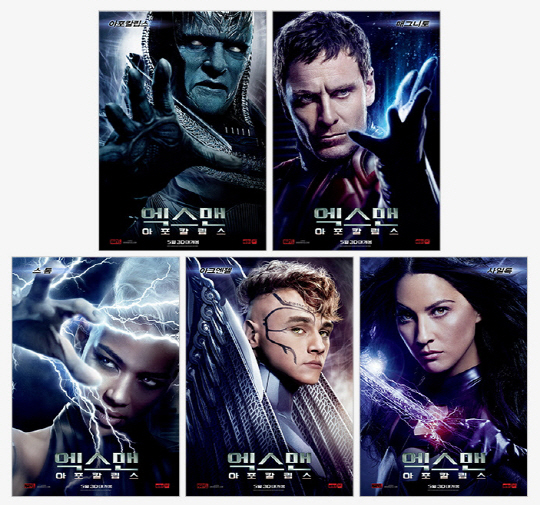 '엑스맨' 시리즈의 클라이맥스를 장식할 할리우드 블록버스터 '엑스맨: 아포칼립스'(감독 브라이언 싱어)가 '아포칼립스 군단'의 5종 캐릭터 포스터를 공개했다. 시리즈 사상 최강의 적으로 등장하는 '아포칼립스'와 그를 따르는 '포 호스맨'의 등장을 예고하는 포스터라 시리즈 마니아들의 관심을 끌고 있다.