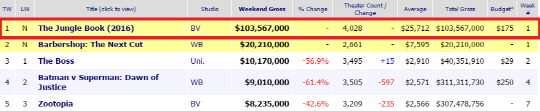 '정글북'의 스코어는 역대 4월 개봉작 중 '캡틴 아메리카: 윈터 솔저'의 6800만달러를 가뿐히 뛰어 넘었고, '분노의 질주: 더 세븐'의 1억4720만달러에 이은 두 번째 오프닝 기록이다. 2016년 기준으론 '배트맨 VS 슈퍼맨: 저스티스의 시작'(1억6600만달러), '데드풀'(1억3200만달러)에 이은 3위 기록이다.