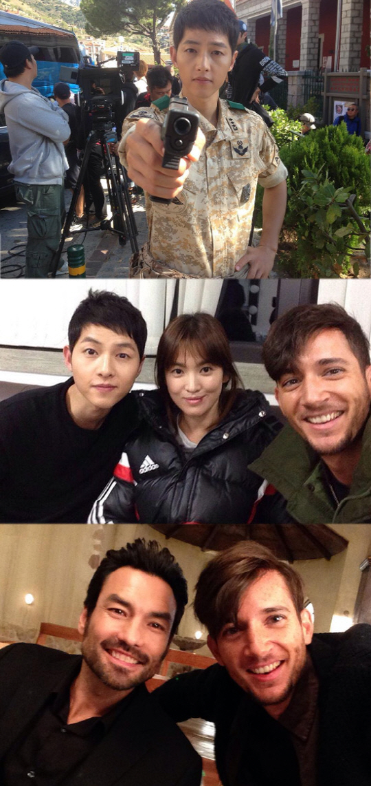 사진 속 송중기와 송혜교, 개이브는 나란히 앉아 카메라를 향해 환한 미소를 짓고 있으며, 데이비드 맥기니스와 개이브는 극 중 모습과는 달리 환한 미소를 선보이고 있어 시선을 끌고 있다.