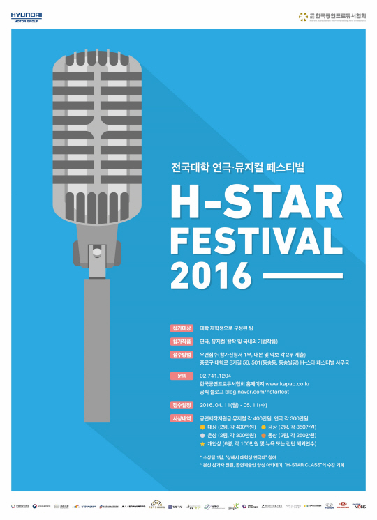 현대자동차그룹과 (사)한국공연프로듀서협회가 공동주최하는 '2016 H-스타 페스티벌'이 오는 5월 11일까지 예선 참가팀을 모집한다. 전국 대학의 연극, 뮤지컬 전공자 뿐 아니라 비전공자(동아리, 극회 등), 2개 학교 이상 연합 참가도 가능하다.