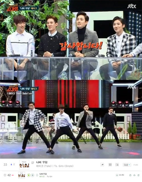 '슈가맨'에 출연해 무려 10년 만에 완전체로 모습을 드러낸 테이크는 대표곡 '나비무덤'을 비롯, 'BABY BABY'를 오랜만에 안무와 함께 라이브로 선보여 당시의 추억을 회상케 하며 감동을 안겼다.