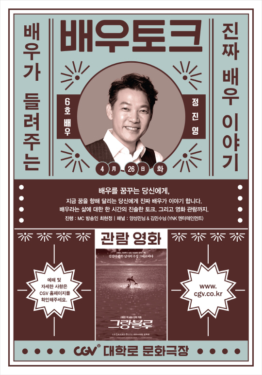 정진영은 "배우 혹은 예술가를 꿈꾸는 청소년을 위한 강연에 몇 번 참석한 적이 있다. 설렘과 궁금함이 가득한 이들의 가슴에 나직하게 격려의 말을 전하고 싶다. 배우토크 자리가 그런 자리가 되기를 바란다"라고 소감을 전했다.