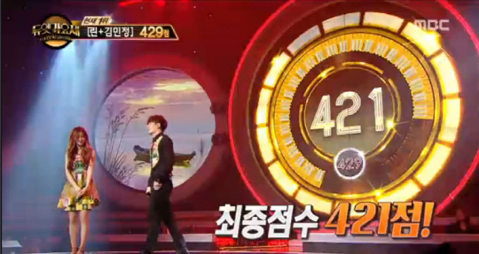 두 사람의 최종 점수는 421점. 두 사람은 진한 포옹으로 서로를 격려했다.한편 '듀엣가요제'는 대한민국 최고의 가수들과 일반인이 함께하는 듀엣 쇼로써, TV에서만 보던 동경한 가수와 함께 듀엣 무대를 갖게 되는 특별한 기회를 찾아주는 프로그램이다. 매주 금요일 밤 9시 30분에 방송된다.